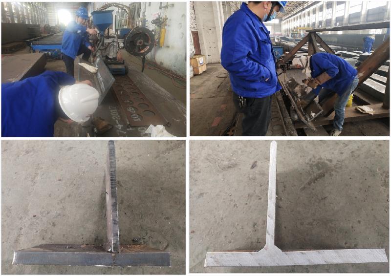????3月初,川船大業(yè)公司技術(shù)部根據(jù)2020年焊接技術(shù)攻關(guān)立項(xiàng)要求,結(jié)合當(dāng)前重點(diǎn)產(chǎn)品比亞迪軌道梁鋼結(jié)構(gòu)項(xiàng)目焊接需要,及時(shí)成立焊接技術(shù)攻關(guān)小組,開展板厚為12—40毫米T型角接焊縫不清根船型埋弧自動熔透焊焊接技術(shù)攻關(guān)。主要攻關(guān)難點(diǎn)為:不設(shè)坡口雙面埋弧自動焊、20毫米以上板厚雙面坡口雙面埋弧自動焊、非坡口面CO2焊結(jié)合坡口面埋弧自動焊焊接單面坡口全熔透角焊縫。試驗(yàn)采取專業(yè)技術(shù)人員全程跟蹤記錄,把控焊接試驗(yàn)數(shù)據(jù)的真實(shí)性和可靠性,解決此前焊縫節(jié)點(diǎn)焊接質(zhì)量受技術(shù)工人技能影響大、穩(wěn)定性不強(qiáng),碳弧氣刨技術(shù)工人不足等問題。與傳統(tǒng)工藝相比將降低50%焊材及耗材的使用成本。