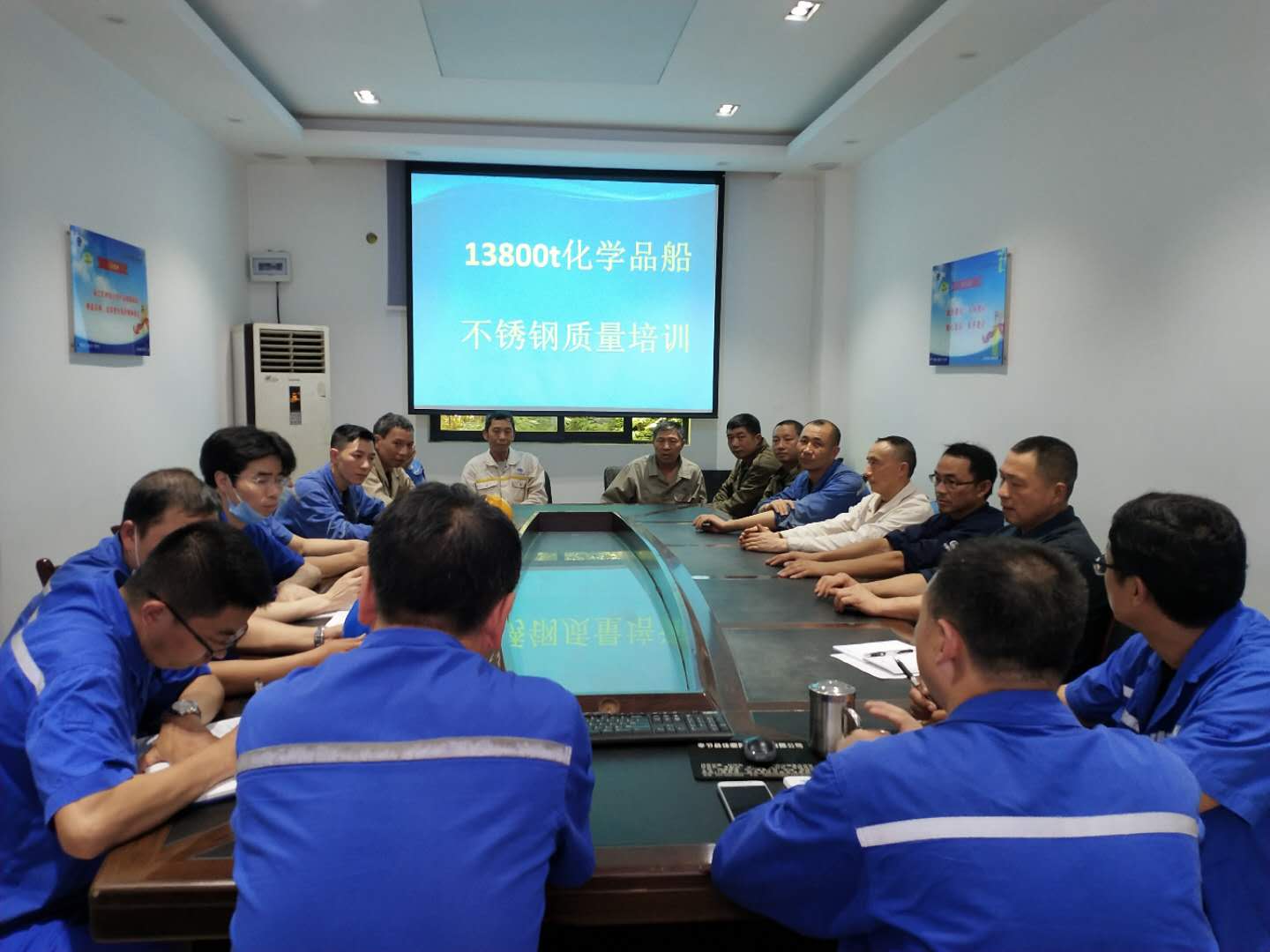 ????為確保13800載重噸不銹鋼化學(xué)品船建造質(zhì)量,提高職工不銹鋼保護(hù)意識(shí),明確不銹鋼轉(zhuǎn)運(yùn)、堆放、裝配和焊接等工作要求。5月18日,船體部舉辦不銹鋼材料管理專題培訓(xùn),由公司質(zhì)管部負(fù)責(zé)人授課,部門負(fù)責(zé)人、工藝人員、班組長(zhǎng)、施工隊(duì)負(fù)責(zé)人參加培訓(xùn)。