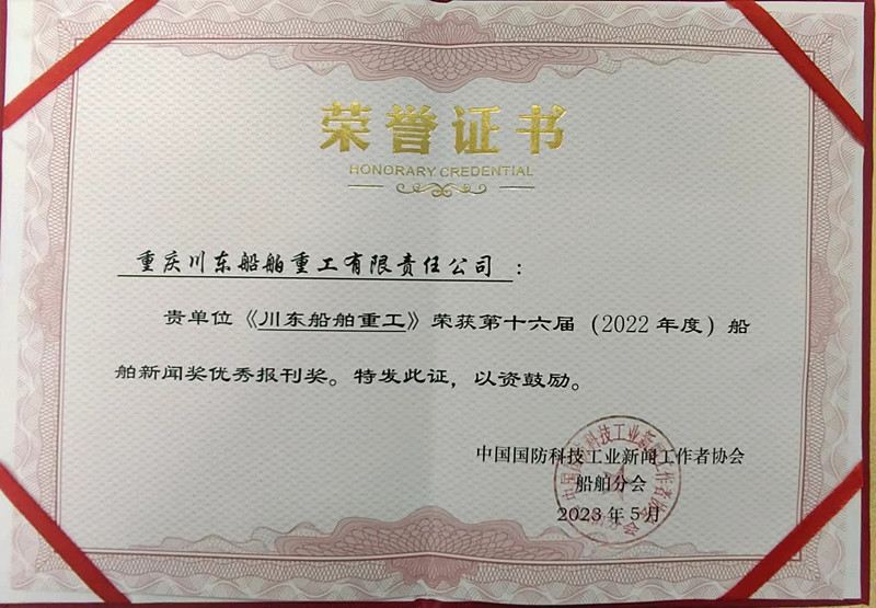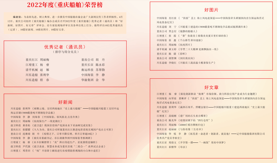 日前,由全國船舶記協(xié)組織評(píng)選的第二十七屆船舶新聞獎(jiǎng)、第十六屆船舶新聞先進(jìn)(優(yōu)秀)企業(yè)報(bào)刊評(píng)選結(jié)果揭曉。中國船舶集團(tuán)川東造船張利華撰寫的《瀛洲石扉開,照耀金銀臺(tái)——川船重工建造西南地區(qū)“史上最大船舶”紀(jì)實(shí)》榮獲船舶新聞副刊類三等獎(jiǎng);《川東船舶重工報(bào)》獲評(píng)(2022年度)全國船舶新聞獎(jiǎng)優(yōu)秀報(bào)刊,公司連續(xù)5年獲此殊榮。