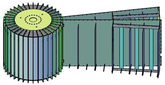 該項(xiàng)目與以往空氣預(yù)熱器的結(jié)構(gòu)有較大變化,主要結(jié)構(gòu)變化為中心筒及短軸408YR02-0、模數(shù)倉格408YR03-0、下部主梁及扇形板408YR321-0、檢修平臺(tái)408YR94-0四個(gè)部套。該項(xiàng)目為雙轉(zhuǎn)子雙小梁結(jié)構(gòu),小梁與主梁的夾角為62.5°,上部主梁扇形板4塊,上部小梁扇形板4塊,下部扇形板數(shù)量與上部相對應(yīng)。